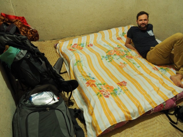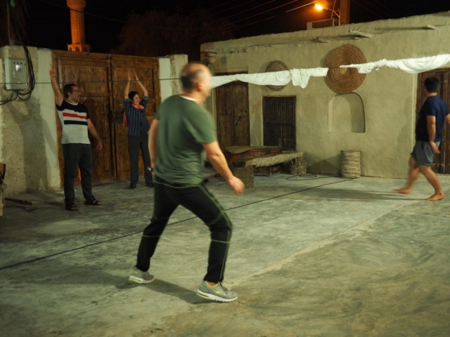6.20 Uhr ist hier Sonnenaufgang am Persischen Golf. Dann ruft der Muezzin zum ersten Mal lautstark über Lautsprecher zum Gebet. Sach mal, muss das sooo laut sein? Irgendwann schläft man dann wieder ein. Gegen 8 Uhr stehen die ersten Gäste in unserer Unterkunft auf. Matthias geht Duschen und absolviert sein Morgenprogramm mit Klimmzügen und Liegestützen. Ich will noch ein bisschen Liegen, nur ein bisschen. Doofer Muezzin. Aber gut schlafen kann man auf dem Fußboden. Das ist problemlos. Matthias kommt mich wecken, das Frühstück ist fertig. Hmm, hier gibt es jeden Tag super leckere Sachen, inklusive persische Kräppelchen und persische Pfannkuchen. Auch ich gehe erstmal Duschen. Das ist übrigens eine logistische Meisterleistung, das mit dem Duschen. Wir haben ein Gemeinschaftsbad und auf dem Weg hin und zurück bitte den muslimisch- iranischen Regeln konform aussehen. Da ist nix mit im Handtuch von A nach B.