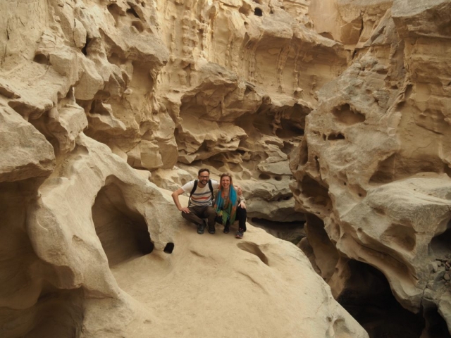 Jetzt wird’s hektisch, wir wollen alle zu den Mangrovenwäldern. Losloslos. Yallah, yallah. Man kann gerade noch das Handtuch schnappen, bevor der Motor angeschmissen wird und extrem laute orientalische Musik ertönt. Die gesamte Mannschaft im Auto klatscht zur Musik mit, und wir lachen viel. 7/8 Takt. Schultertanzen – so tanzen Männer hier. Man stelle sich vor, wie Shakira mit ihrem Arsch superschnell hin- und herwackelt. Nur eben mit den Schultern. Das kann man auch im Auto. Währenddessen zieht die Wüstenlandschaft an uns vorbei. Und dann steigen wir ins Boot in die Mangrovenwälder. Vom Boot aus klettern wir dann auf Surfbretter und paddeln los. Natürlich gibt es die obligatorische Wasserschlacht, egal ob Elsterkanal in Leipzig oder hier im Iran. Das ist international. Und dann wird man ins Wasser geworfen. Ich als Frau fliege natürlich mit langer Hose und langärmeligem Oberteil ins Wasser. Wenigstens hab ich das Kopftuch im Boot gelassen. Und zu guter Letzt setzen wir uns auf die Surfbretter und lassen uns vom Motorboot mit high speed ziehen. Und in der Kurve… fliegt man rein ins Wasser. Ein schöner Vormittag. Danke, Iran.
