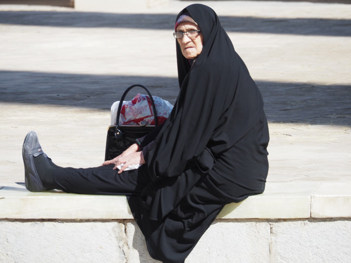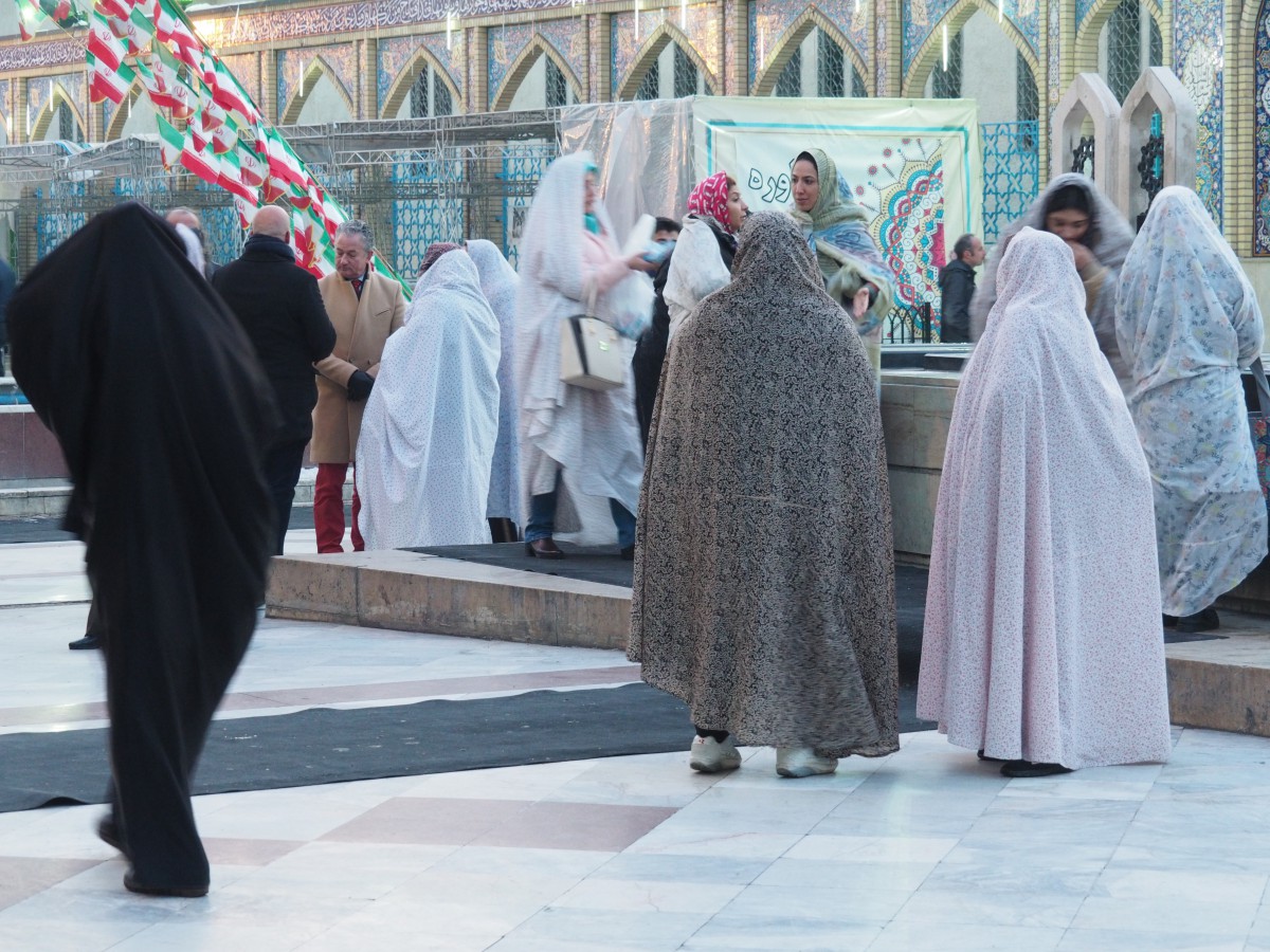 In manchen Ländern wird es als freie Wahl oder als „nur Kopftuch“ bis hin zur Verpflichtung zur Burka verstanden. Und Kopftuch ist nicht gleich Kopftuch. Es gibt noch Spielarten der Hijabs, die ich erst hier kennengelernt habe. Al Amira ist so eine feste Badekappe oder Schweißband und darüber kommt dann das einteilige Tunneltuch mit Loch fürs Gesicht. Dann die Batula, da sieht frau aus wie ein Vogel. Mit so Schnabel im Gesicht. Das tragen Frauen im Süden vom Iran. Dann der Chador, der ist häufig und überall zu sehen. Im Prinzip ist das ein Bettlaken, womit man sich zusätzlich zum Kopftuch und zur Pobedeckung von Kopf bis Fuß verhüllt. Frau sieht von vorne wie von hinten wie ein Kegel aus. Ich musste in manchen religiösen Schreinen und Moscheen zusätzlich einen Chador tragen. Das habe ich als sehr störend empfunden. Das Bettlaken hat ja keine Schlitze für die Hände. Es hält auch nicht von allein. Die Frauen müssen es entweder mit der Hand zuhalten oder mit den Zähnen reinbeißen oder den Chador so wickeln, dass er am Endstück unter den Arm geklemmt werden kann. Frau ist aber die ganze Zeit damit beschäftigt, den Chador zu fixieren. Auch eine indonesische Touristin quälte sich neben mir ab. Mit Chador habe ich mich wirklich diskriminiert gefühlt. Es gibt noch die Niquab, die Kombi aus Kopftuch mit Zusatztuch über Nase und Mund. Und dann natürlich die Burka, der komplette Kegel mit Gitterfenster zum Durchgucken. Mein Gott.