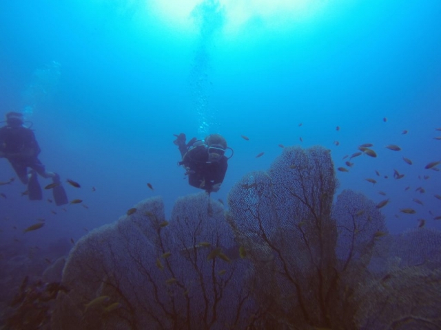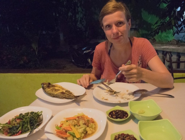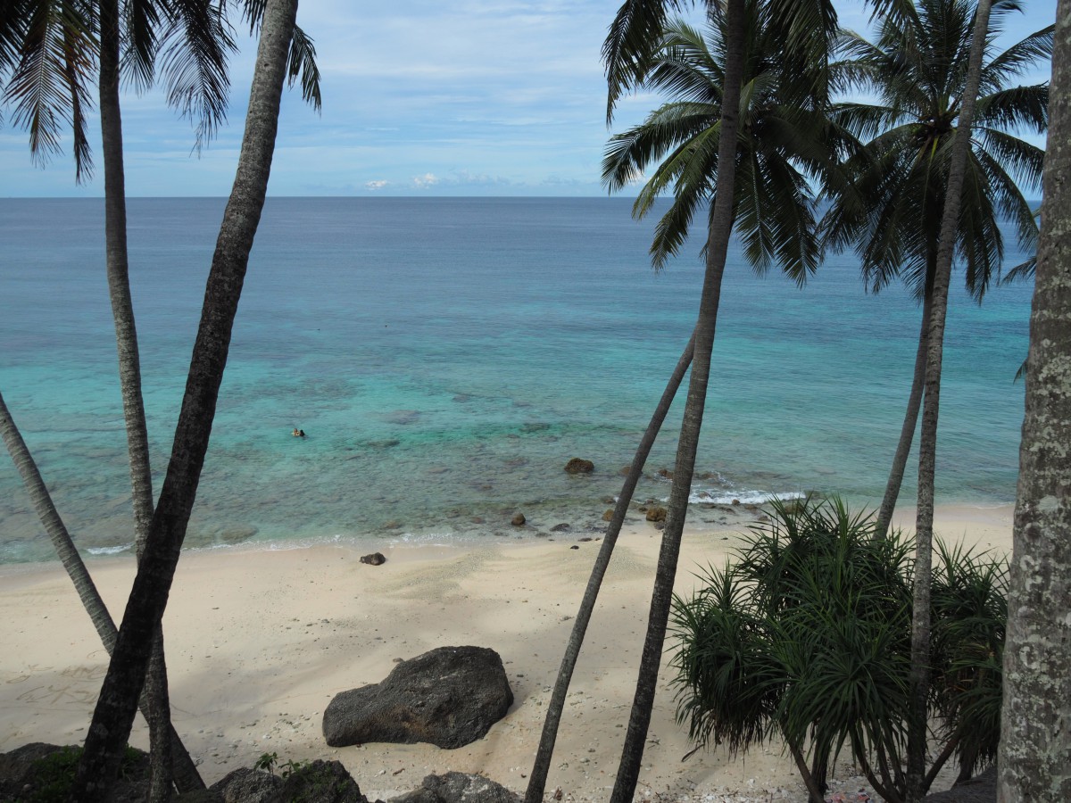 Für ein paar Tage haben wir einen ganzen Strand für uns alleine, abgesehen von einzelnen Einheimischen und verschiedensten Krabben, die hier entweder superschnell über den Strand flitzen oder sich im Mini-Muschelhaus eher langsam fortbewegen. Unsere Tage fliegen dahin. Vor dem Frühstück eine Runde im türkisen Wasser schwimmen, dann gibt es frischen Mangosaft und Bananen-Pfannkuchen. Danach geht es zum Tauchen ins nächste Dorf, dann wieder Abhängen und Buch lesen. Wenn man Abendessen geht, kann es schon mal vorkommen, dass nach 45 Minuten das erste Gericht kommt und der Koch mitteilt, dass die Zutaten für das zweite Essen leider aus seien und man sich etwas anderes aussuchen solle. Hätte er das nicht schon am Anfang rausfinden können? Ja, aber so ist das hier auf der Insel. Man denkt nicht soweit in die Zukunft. Warum sollte man auch?