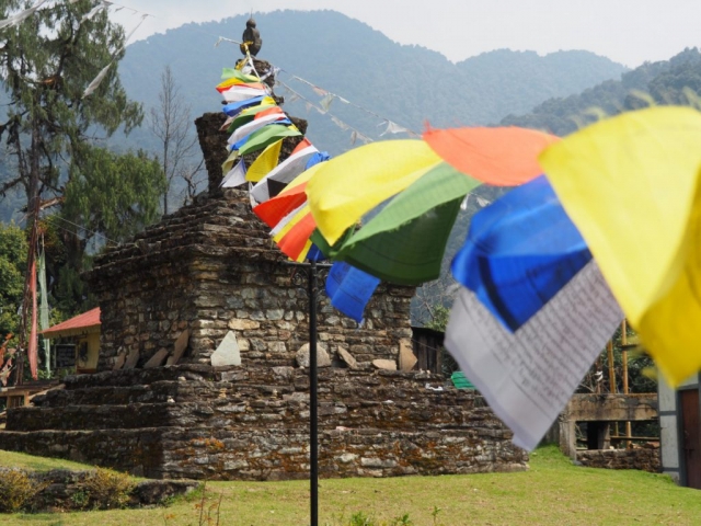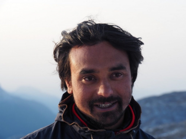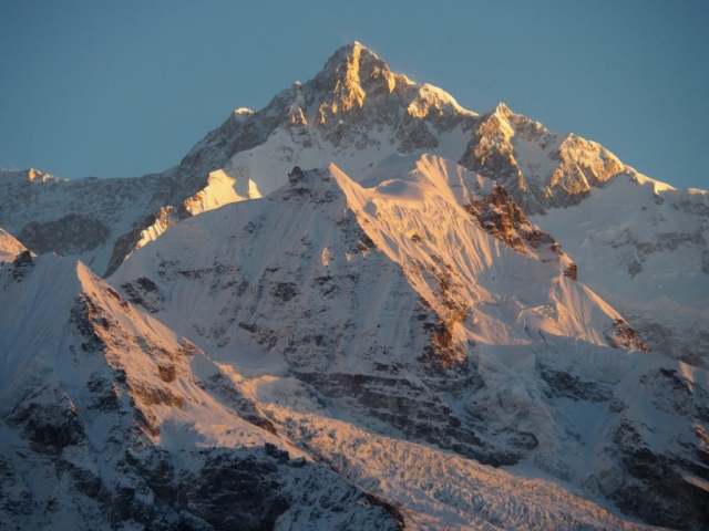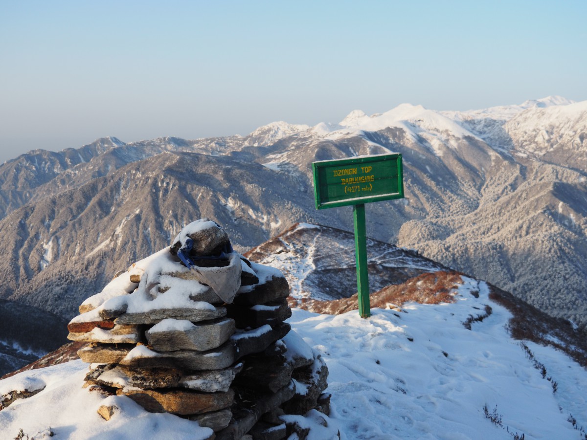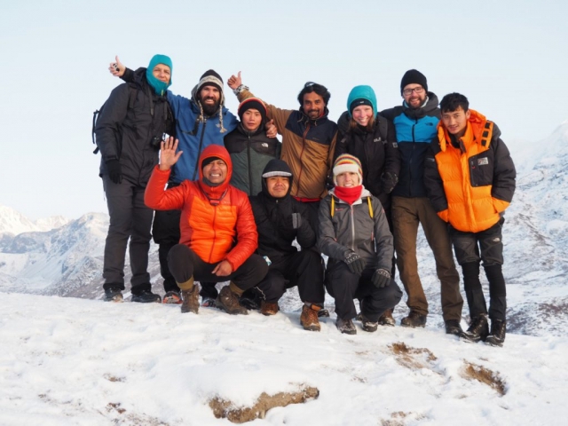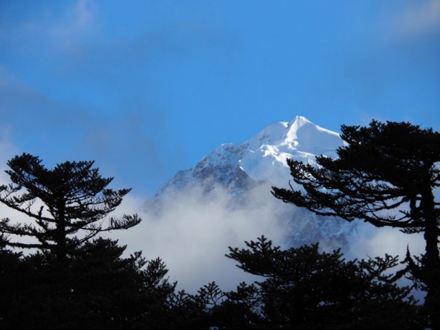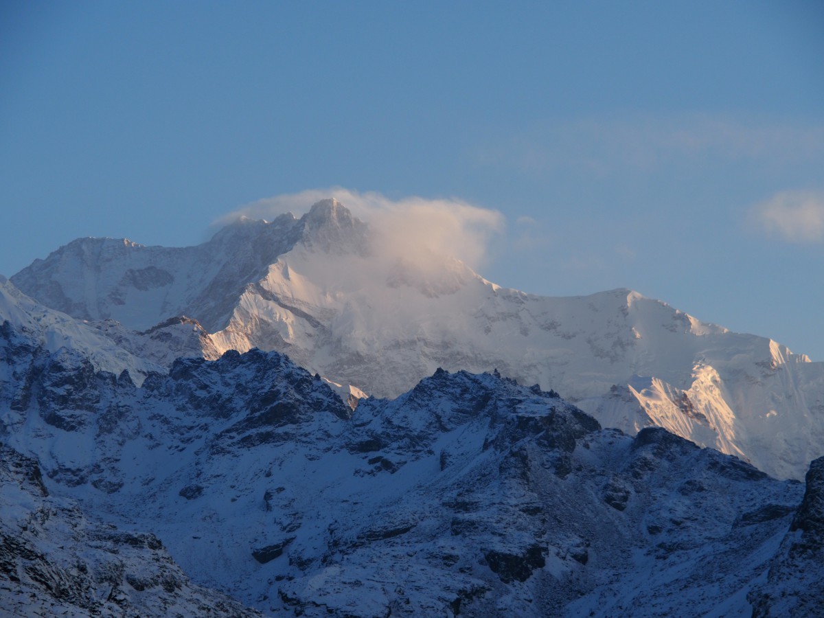 After sunrise and maybe 200 photos it gets quite steep. I feel good, but then I realize that there is no point in hurrying, our guide by the name of Budda is always waiting for the rest of the group. I’m a little surprised that I’m first behind the guide. Our two Spaniards, oh Sorry, a Spaniard and a Catalan, are actually the fittest. Juan is an ultra-marathon runner, but Jordie had altitude sickness the last few days. When the sun transforms the valley into a glittering white, the two guys speed up and overtake us. I realize that I can’t keep up anymore and get in lane behind Conny, who has always set a pace that was just right for me the last few days. A few minutes after the guide and the Spaniards but before the young Indian Vicky we reach the viewpoint totally exhausted. Just breathe, then get the camera out. Or maybe satisfy the massive hunger with our packed lunch? It doesn’t matter, just be quick, the clouds from the valley can arrive at any time. After these matters have been settled, we are staring at this wonder of nature that presents itself before us. We are now only a few kilometers away from the Kangchenjunga, only that with 8586m (28,169 ft) it is four kilometers higher. The GPS with geoid correction shows our altitude at 4620m (15157 ft). That’s as high as it goes, from here on there’s restricted area. I am proud to have made it here without altitude problems and I am totally tired looking for a rock on which I can settle down. I fall asleep in the warm sunshine. Then the clouds arrive, one of us didn’t make it. Suresh, the other Indian, is 56 years old and just a bit too slow. Too bad for him.