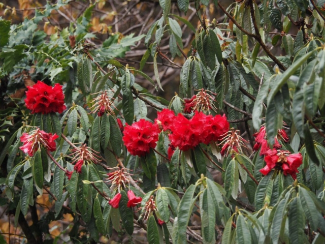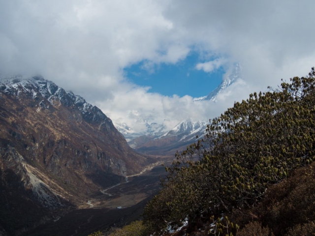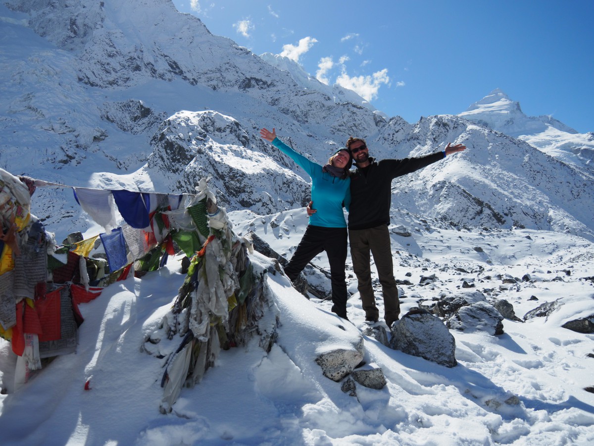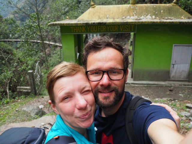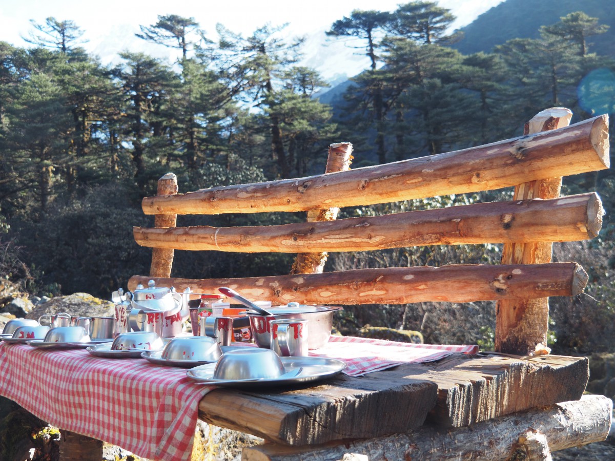 On the way down, the experiences of the last days go through my mind again. The long way from our starting point at 1750m, how Conny was pushed off the path by a wild, pregnant yak (well, she had wished for wild yaks), getting used to the toilet situation, where not everyone has always hit the hole, a lick and a promise with ice-cold creek water, the blooming rhododendron on the way below 3500 m, the delicious food, that our team conjured for us from everything the Dzos carried (even chocolate cake we had in the Himalayas), the beautiful views every morning, the jolly atmosphere in our group of six people, from whom we were indulged additionally with wonderful Spanish sausage and Italian cheese, but also the cold, as soon as you come to rest, no matter how much you wear. For a long time, we had cured ourselves and waited in order to be able to experience this trek. Now we are torn between the sadness that the trek is soon over and the anticipation of a warm shower and a soft bed.