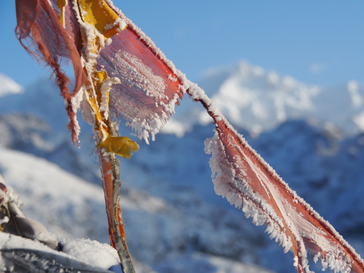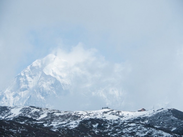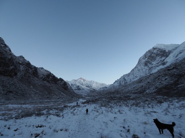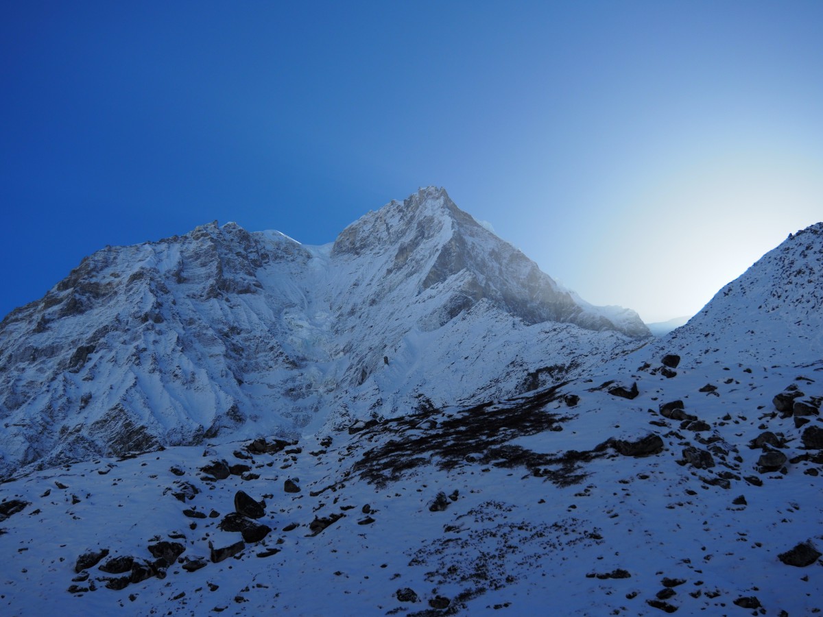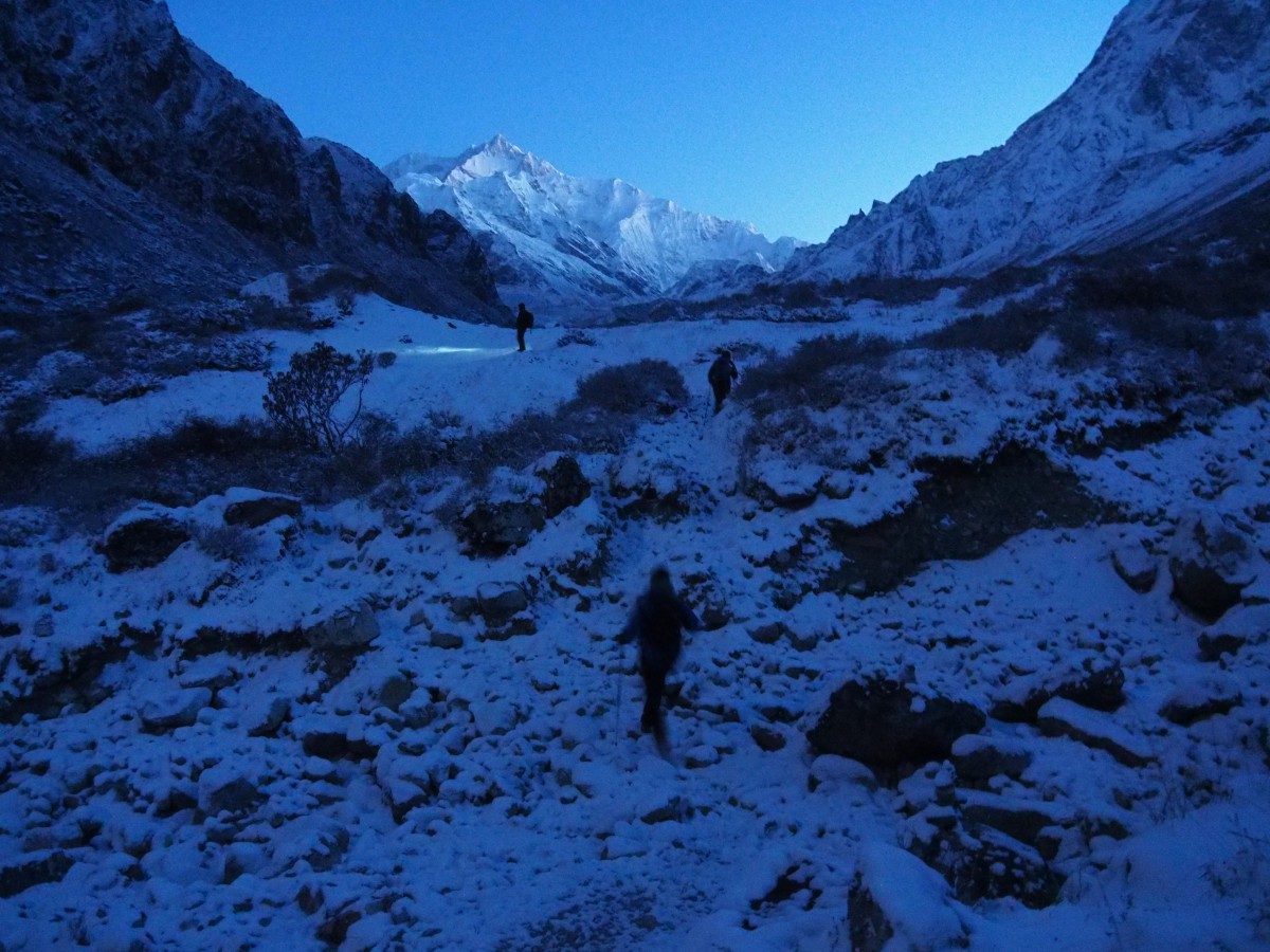 Three in the morning. Several mobile phone alarms ring. It’s day three at 4,000 meters (13000 ft), day five of the trek. Only my nose sticks out of my three sleeping bags: a hut sleeping bag in my 5 degree sleeping bag, which in turn is in the sleeping bag of the tour operator. The whole thing on a thin mat on wood. My pants and fleece are also in my sleeping bag to warm them up. Nevertheless, it is best to put everything on as quickly as possible and to slip into my mountain boots so that the ski socks don’t get cold. I stomp out of the unheated hut through the freshly fallen snow to the outhouse. Listening to the crunching snow, I estimate the temperature at -15 degrees. Our transport Dzos (crossing of Yak and cow) must have frozen badly this night, not to mention the horses of the other groups. Having arrived at the toilet, I don’t see as much of the variety of human excrements as before and you can smell them less in the cold. Thank God the sky is clear, the full moon tints the giants of the Himalayas in a blue glow. Euphoria starts to grow and warms me up, because if it is clear now, we will see the sunrise and afterwards have good weather at our destination.