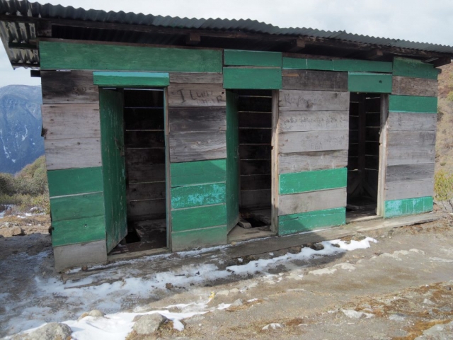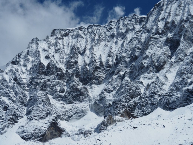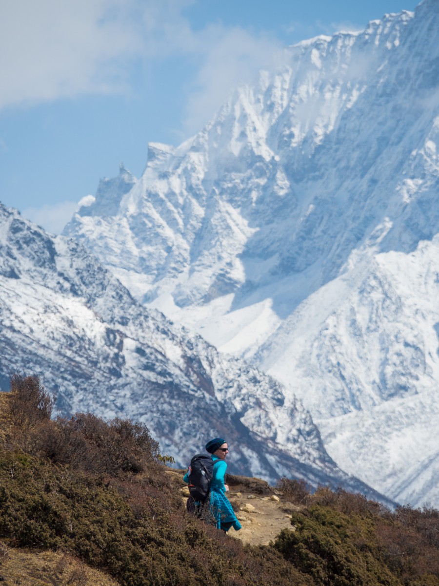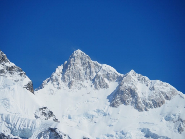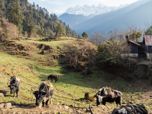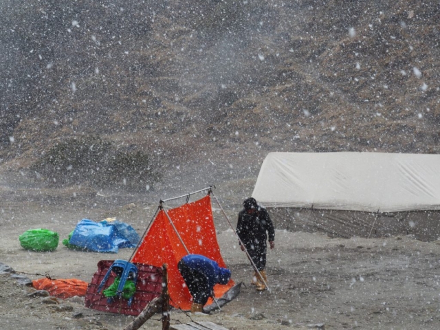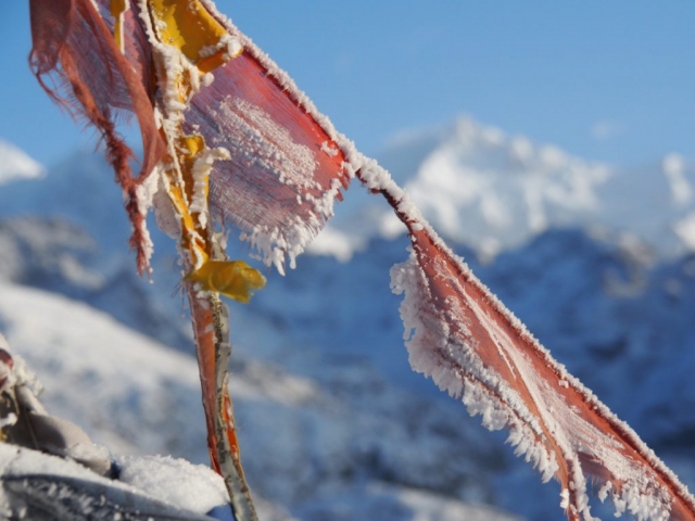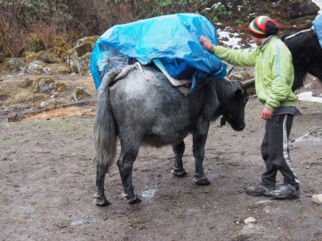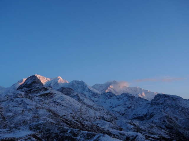 Three in the morning. Several mobile phone alarms ring. It’s day three at 4,000 meters (13000 ft), day five of the trek. Only my nose sticks out of my three sleeping bags: a hut sleeping bag in my 5 degree sleeping bag, which in turn is in the sleeping bag of the tour operator. The whole thing on a thin mat on wood. My pants and fleece are also in my sleeping bag to warm them up. Nevertheless, it is best to put everything on as quickly as possible and to slip into my mountain boots so that the ski socks don’t get cold. I stomp out of the unheated hut through the freshly fallen snow to the outhouse. Listening to the crunching snow, I estimate the temperature at -15 degrees. Our transport Dzos (crossing of Yak and cow) must have frozen badly this night, not to mention the horses of the other groups. Having arrived at the toilet, I don’t see as much of the variety of human excrements as before and you can smell them less in the cold. Thank God the sky is clear, the full moon tints the giants of the Himalayas in a blue glow. Euphoria starts to grow and warms me up, because if it is clear now, we will see the sunrise and afterwards have good weather at our destination.