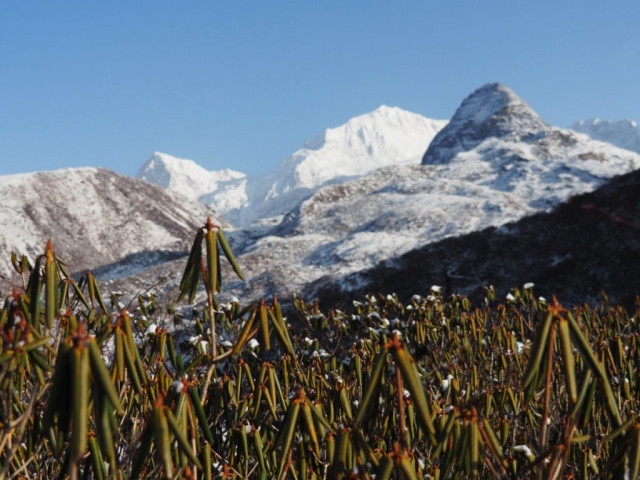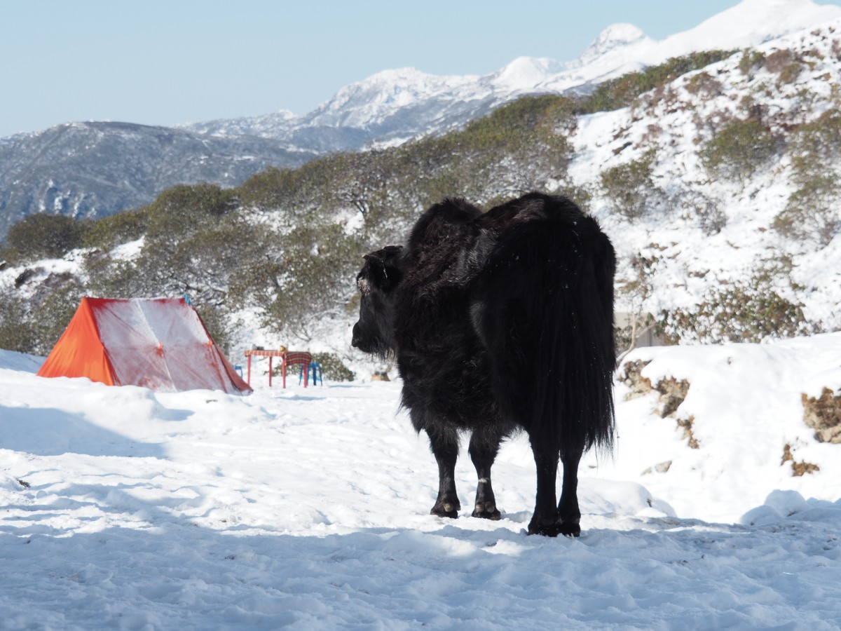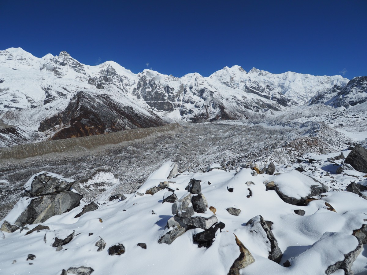 Almost every day there is the same spectacle. In the morning it is nice weather, the maximum temperature of the day is reached around ten o’clock, the snow melts, then it gets cold again and it snows again. Our cook prepares us a small breakfast with porridge and tea, then we start through the valley towards Goecha-La, the highest point of our 8-day tour. We trudge over frozen streams through the moonlight, you don’t need a lamp. It is slowly getting lighter and we can already see the snow-covered peaks of Kangchenjunga, the third highest mountain in the world. However, something’s different than two days ago. There is not that euphoria, not the tears in the eyes like at the Dzongri lookout, where the mountain range appeared all of a sudden and I was struck by the beauty of what I saw there. Here the majestic mountains appear slower and I feel a bit uneasy because there are still a few hundred meters of altitude difference ahead of me, all well over 4000 m (13,000 ft). The air is thin and if you go about it too fast, you get a headache and may not make it to the finish line before the clouds arrive.