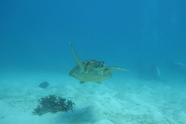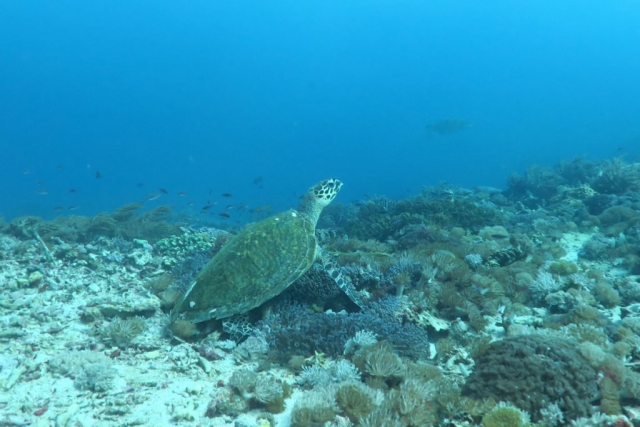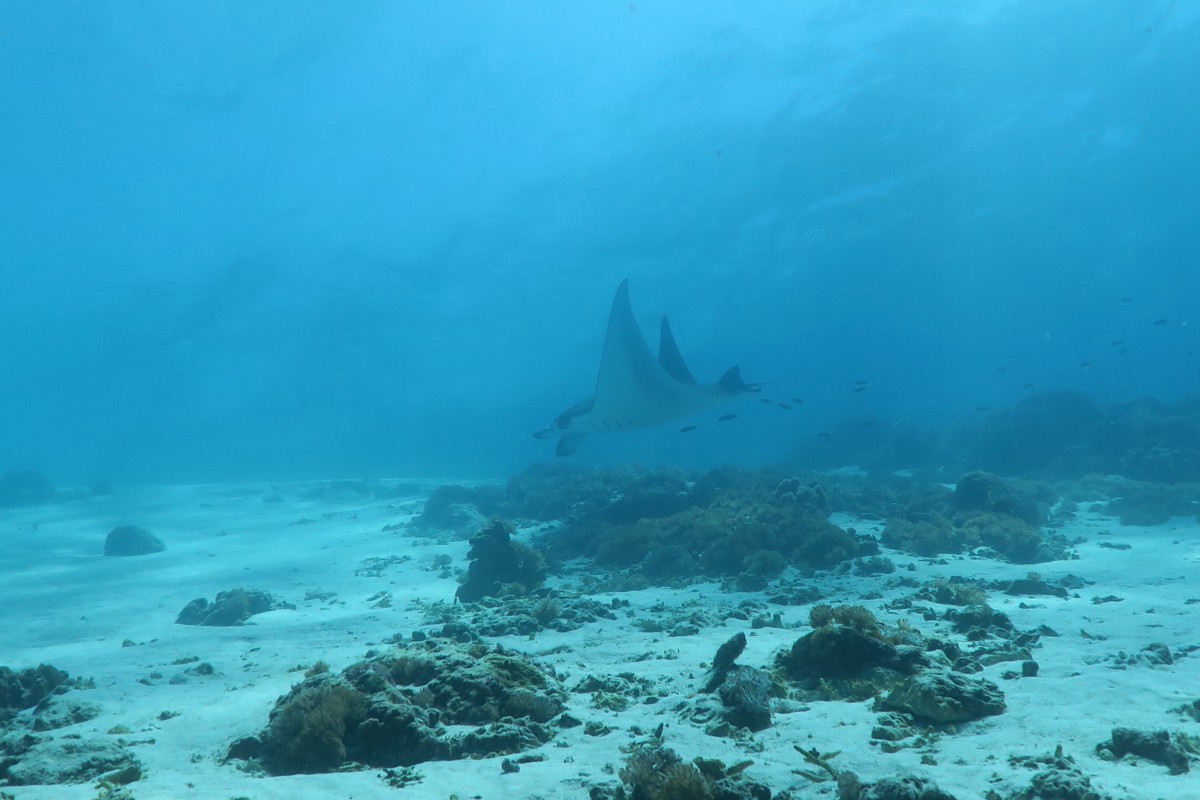 On the second dive we swim to the cleaning station of the Mantas. These cleaning stations are places in the sea, where Mantas always return to and wait for smaller fish that clean their smaller injuries e.g. from shark attacks. For us it’s a unique opportunity to see Mantas face to face. And here they are. A few Manta Rays want a beauty treatment today. One of the Mantas passes closely over our heads. If I had an underwater camera, I would have loved to take a picture of the belly. I would have sent it to the Manta researchers via email. The scientists then match the patterns on the belly with a database. And if the same Manta was photographed somewhere else I’d receive an email, where it is hanging out at that time. But we don’t have an underwater camera. So we enjoy the dive and the gliding of the huge fishes through the water. Shortly before we run out of air in our tanks, we get the chance to say hello to a shark and a turtle. Super happy we climb back to the boat and chug to the next dive site.